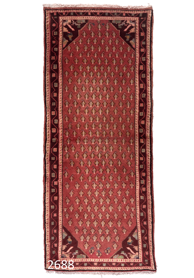 Arak rug with boteh pattern and low pile. The field color is red abrash, and the borders are brown.