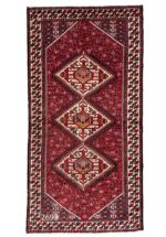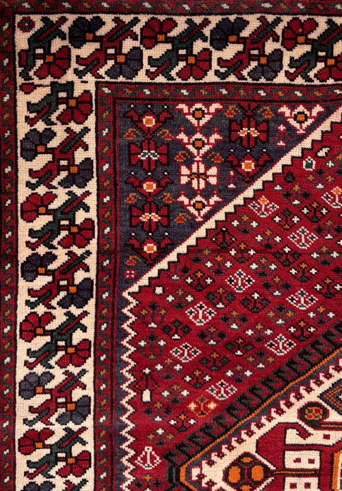 Three-medallion Bakhtiari rug woven in Shahreza. The design is largely inspired by Qashqai patterns, reflecting the mixed population of Bakhtiari and Qashqai people in Shahreza. The materials and weaving technique classify it as a Bakhtiari rug, but the motifs used are Qashqai. The pile is medium to low.